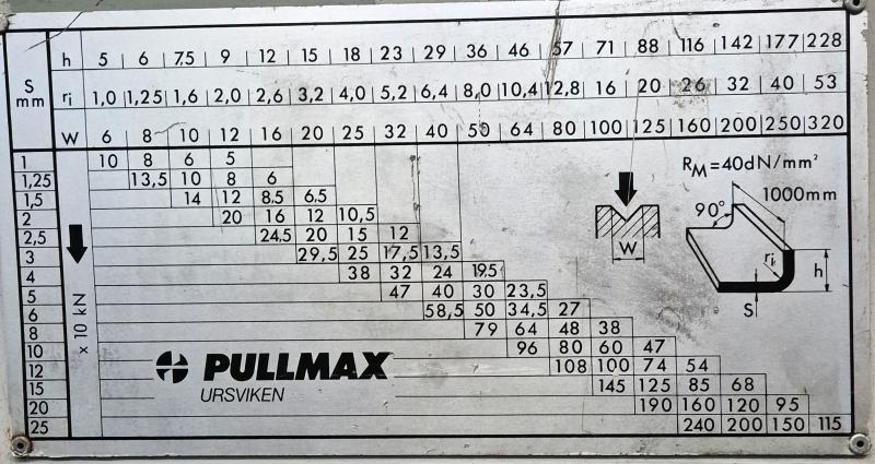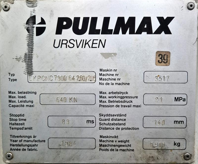 fabrikat Pullmax Ursviken type EKP CNC 7300 64 2,60/2,05 2600 mm med 2050 mm mellem søjler. 64 tons, Cybelec DNC 880S CNC styring. lysgitter både for og bagved. Bagstop kan flyttes automatisk til siderne. manualer, segmenter, 2 hånds betjening.