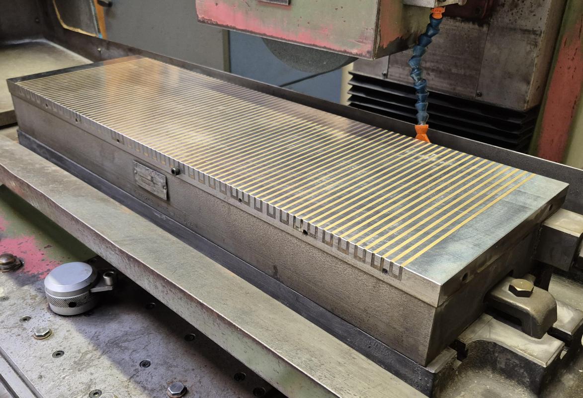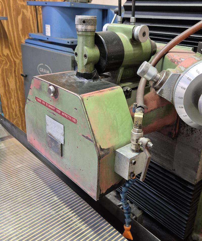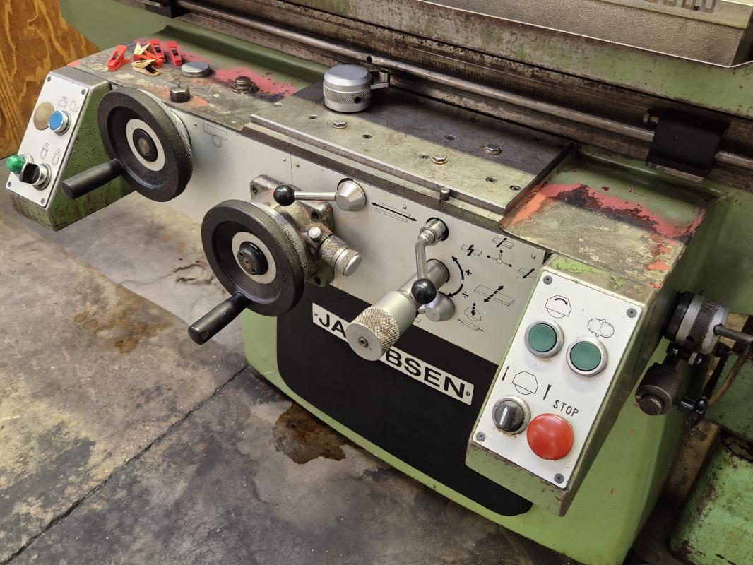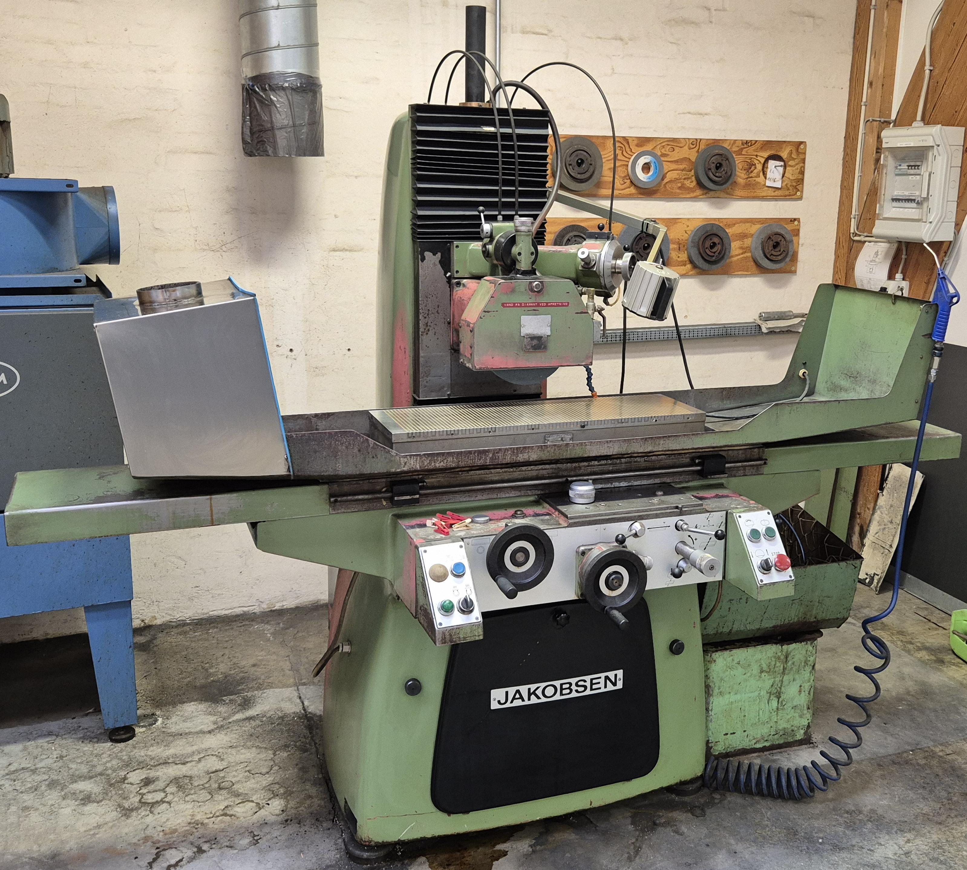 fabrikat Jakobsen SJ 16 elektromagnetisk plan på 250 x 800 mm. Automatisk spån fortsæt, mange ekstra nav, afbalancerings buk, Eclipse afmagnetisering, manual, ny ekstra sten, opspændings sæt, kølevands anlæg.
