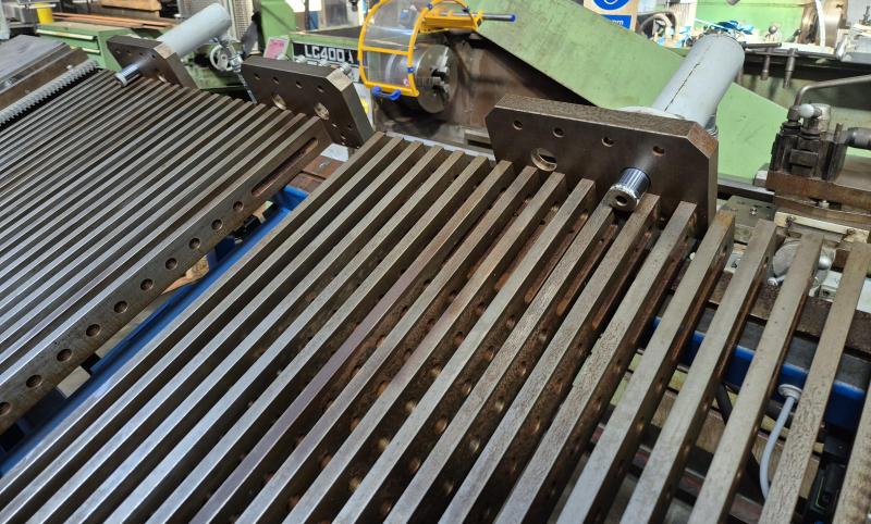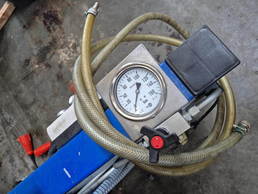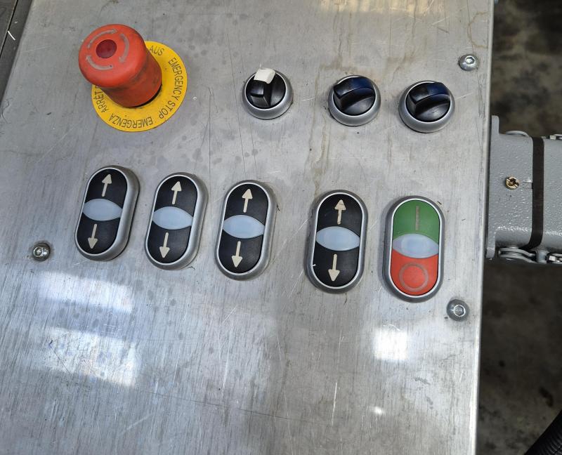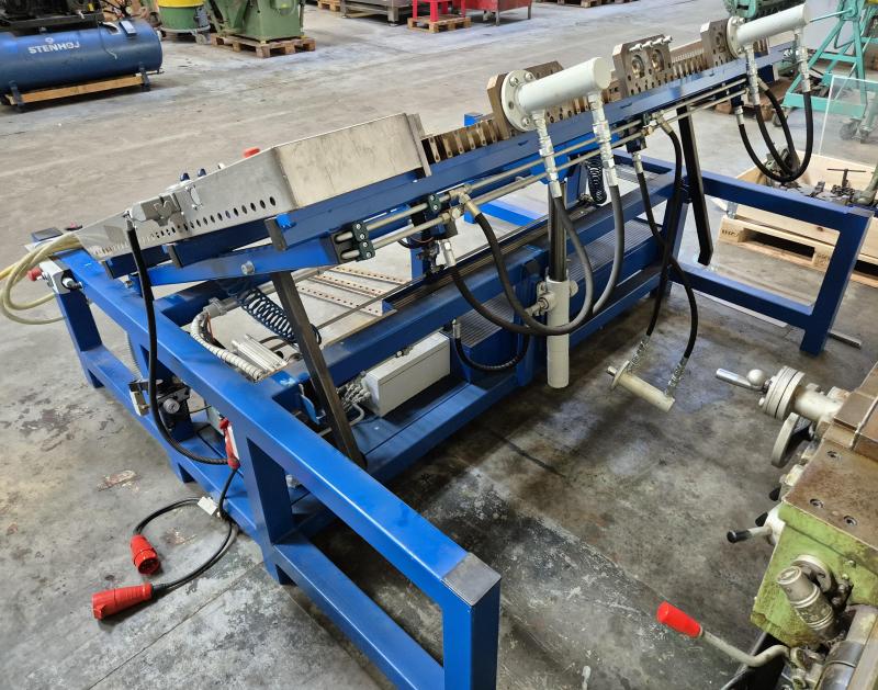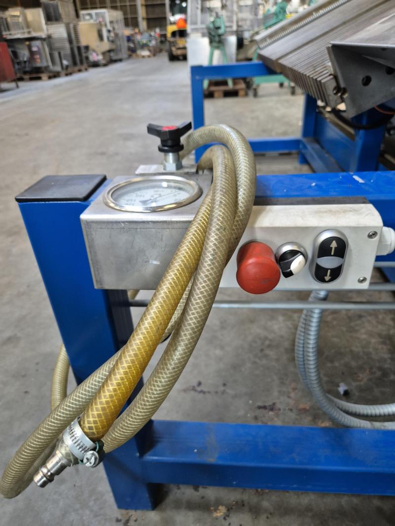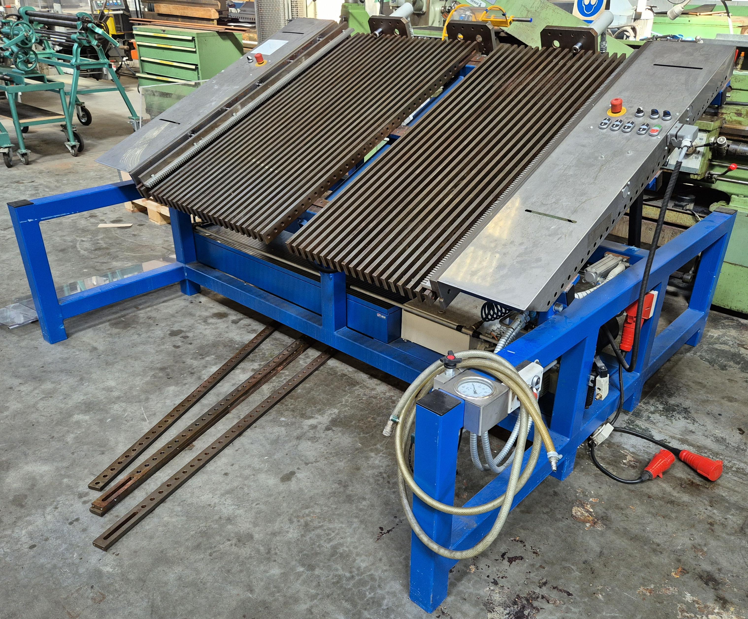 B 1600 x D 1400 x H 800 mm med hydraulisk kip op til mindst 45 grader og 3 cylindre til at presse (kan bevæges individuelt også) Pneumatisk tilhold i siderne.