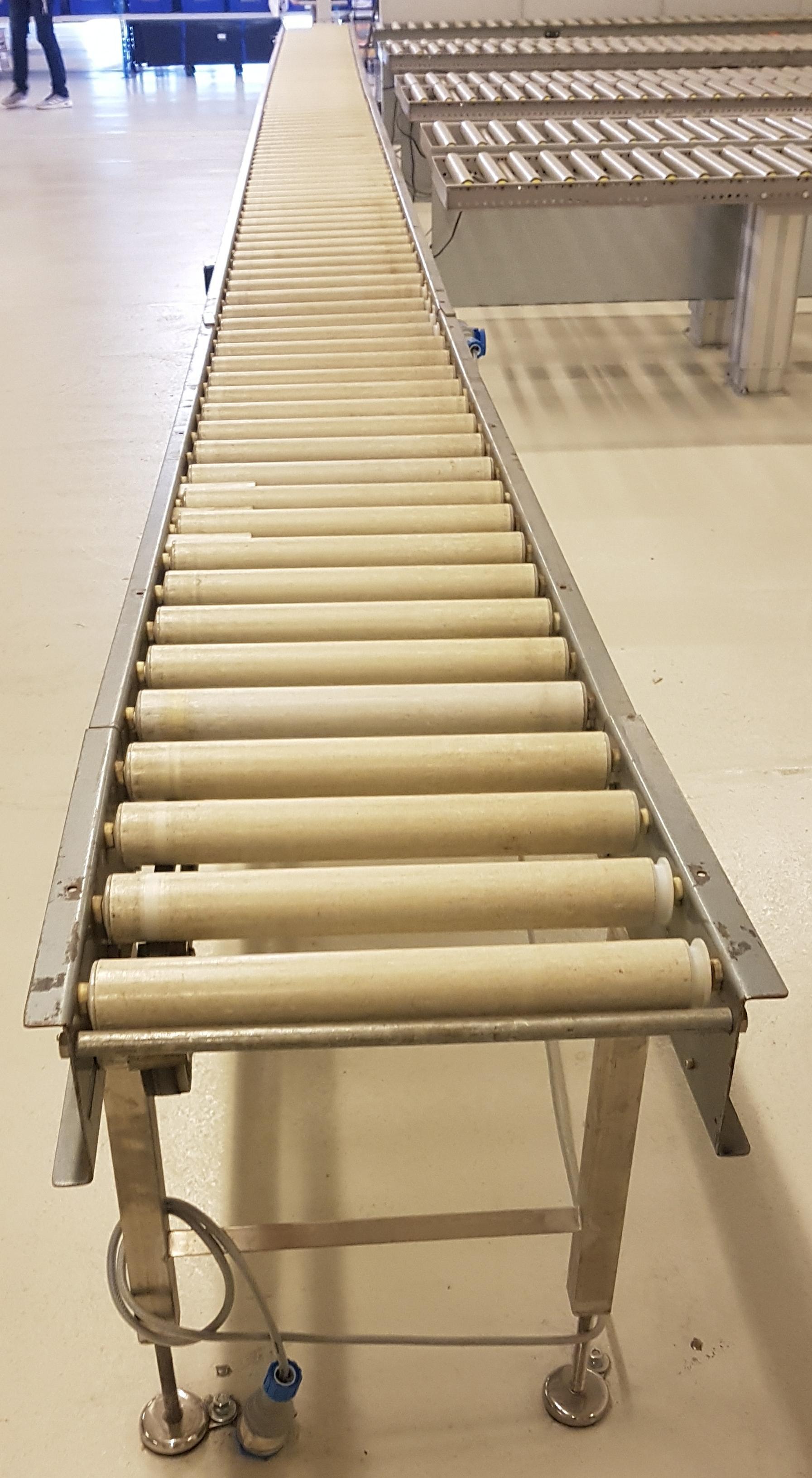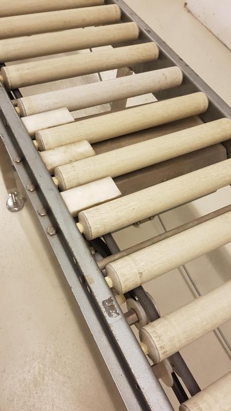 Ø50 x 400 mm x 10,5m Fabrikat KJ maskinfabrik. Består af 1 bane på 2,3m og 1 bane på 10,2m. Begge har egen motor, og driver rullerne med underliggende rem.