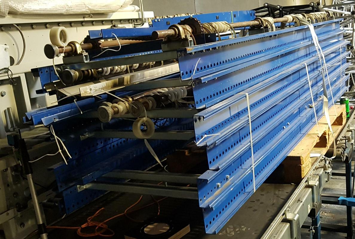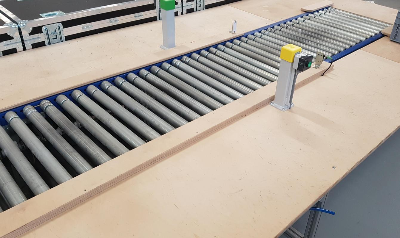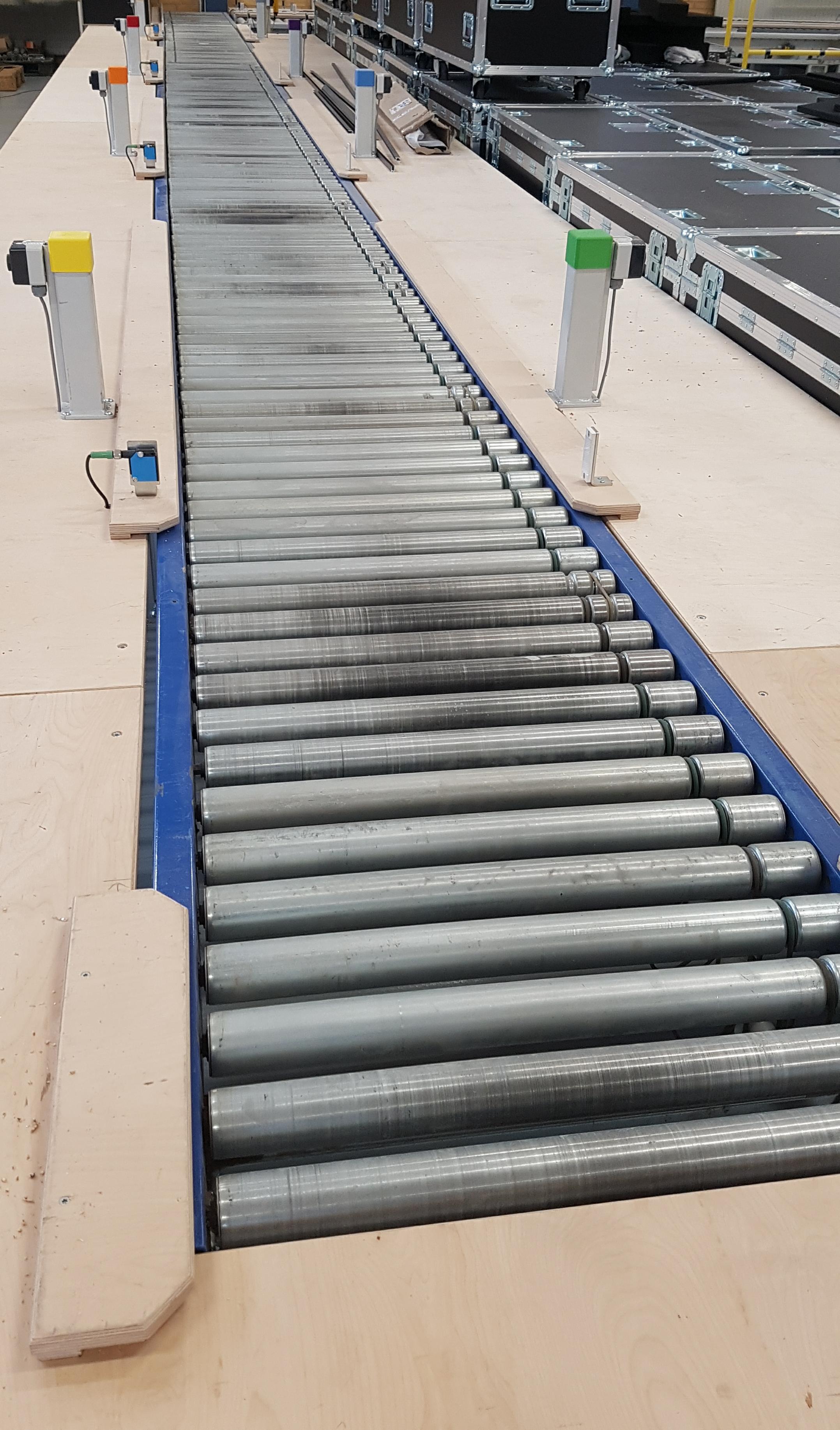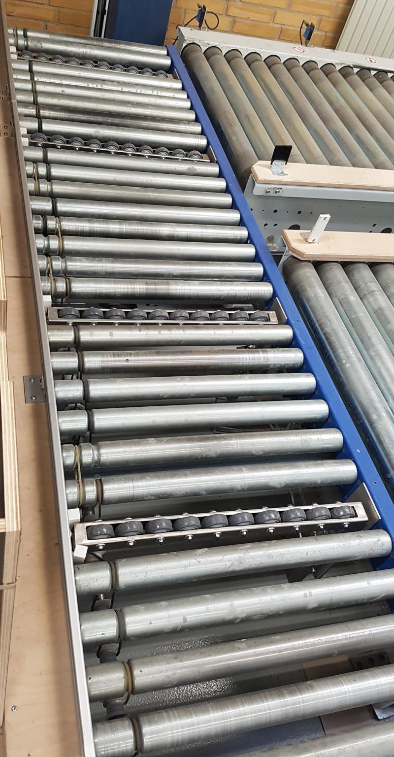 Ø50 x 600 x H 600 mm (justerbar opad) Stålrulle, dreven via underliggende aksel og rundrem.11 styk 2,8m og 1 stk på 1m. I 90 grader dreven sving og 1 90 grader letløbsving.90 mm CC cirka.