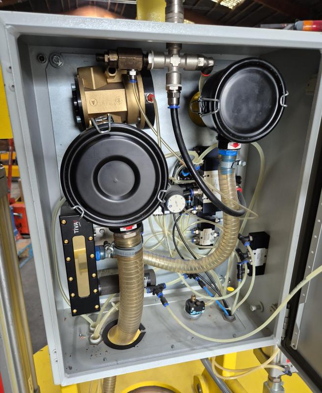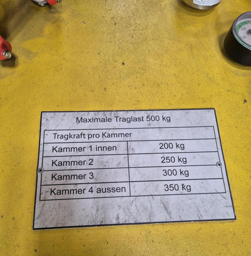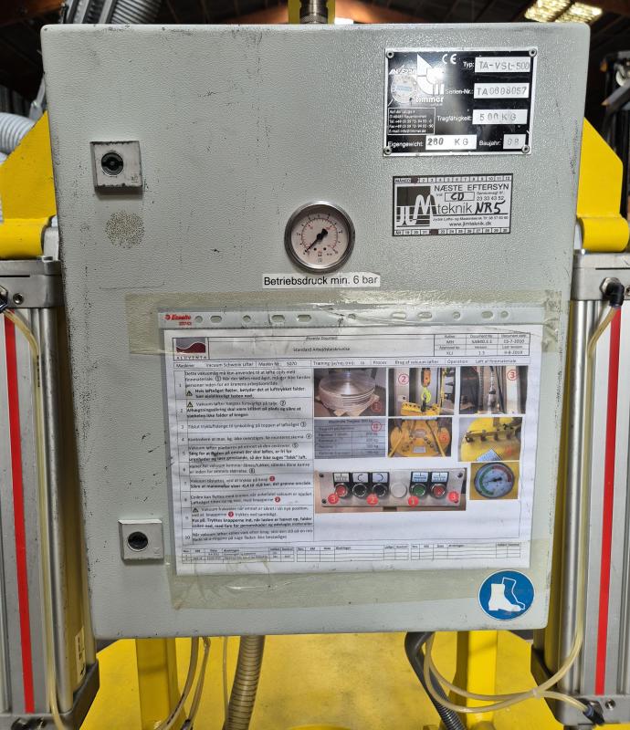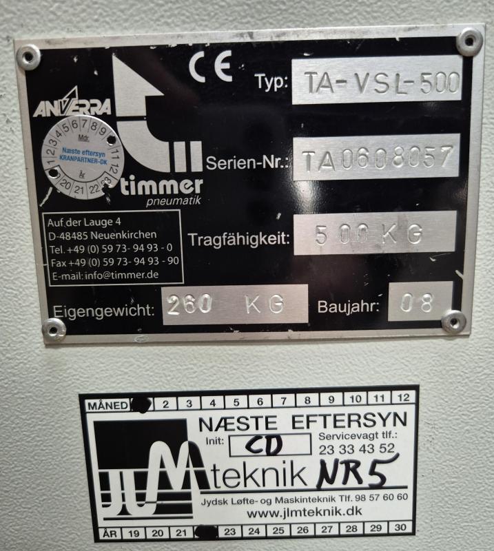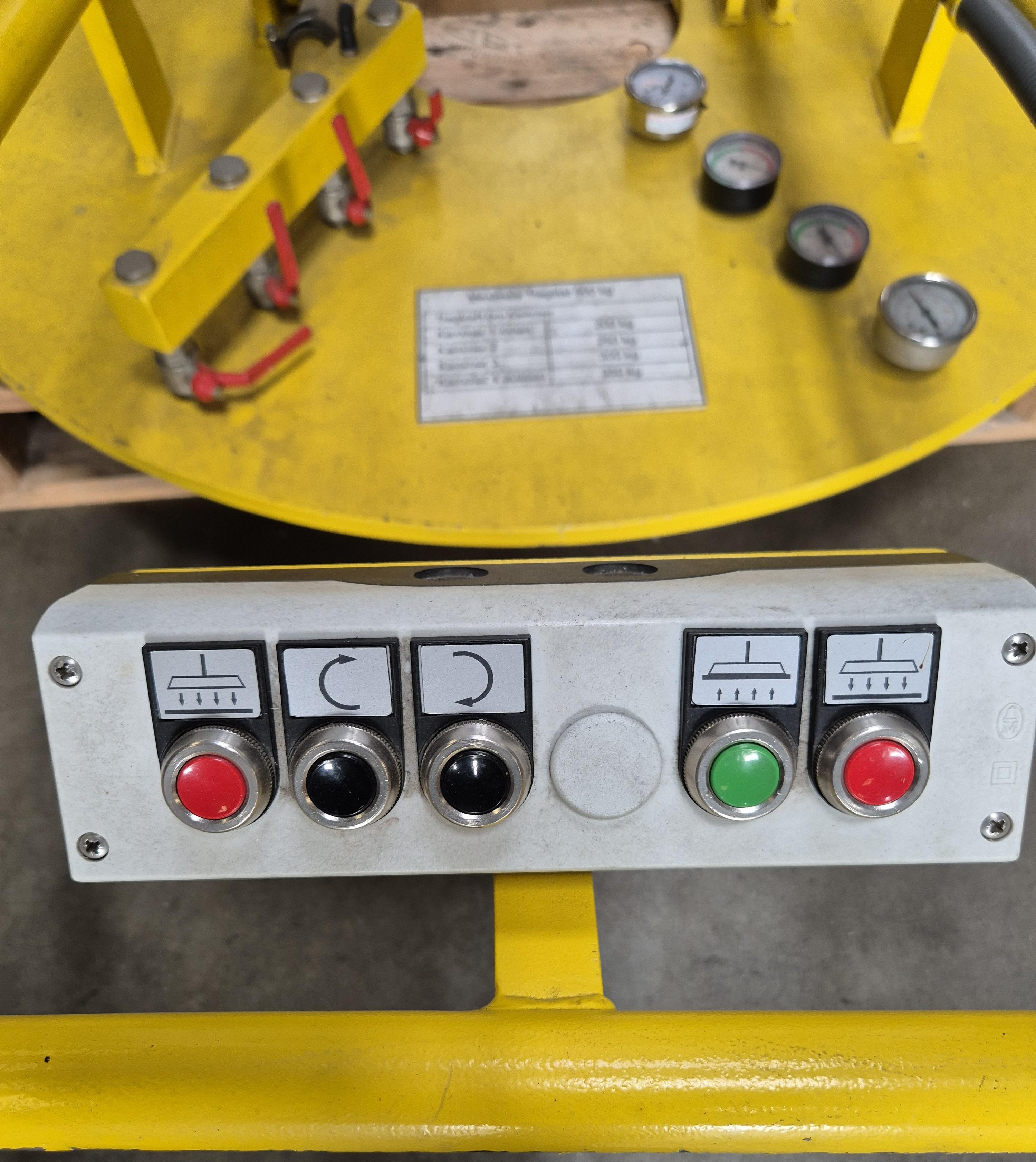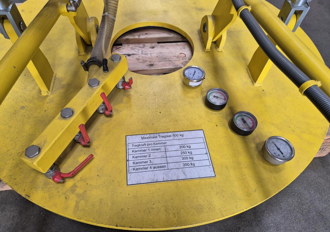 fabrikat Anverra Timmer Pneumatic Ø1200 mm. 500 kg løfteevne, kan opdeles i zoner. Kan vippe 90 grader med pneumatik. Ophænges i talje og tilføres kun trykluft. Kun lidt brugt.